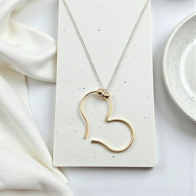 Add a touch of elegance and love to your jewelry collection with our Open Heart Necklace. The sterling silver chain perfectly pairs with the handmade gold open heart charm and delicate gold beads, creating a stunning and timeless accessory. Gift this necklace to someone special or treat yourself to a symbol of love and beauty.