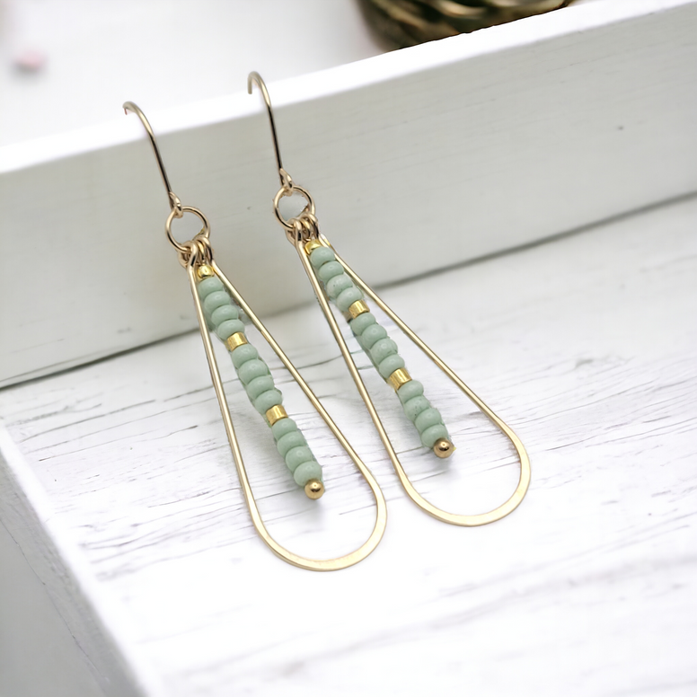 Add a touch of fun and femininity with our Harley gold teardrop earrings, adorned with delicate mint green seed beads. Perfect for any occasion (and any outfit), these long earrings will complete your look and add a hint of whimsy to your style. A must-have for any accessory lover!