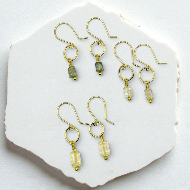 Tiny treasures and major sparkle with our Deep Forest color set! These delicate mini hoops feature genuine handcut gemstones that catch the light beautifully. Choose from rich Green Apatite, dreamy Prasiolite, or sunny Citrine, each paired with your choice of silver or gold.  Small in size, big on personality.